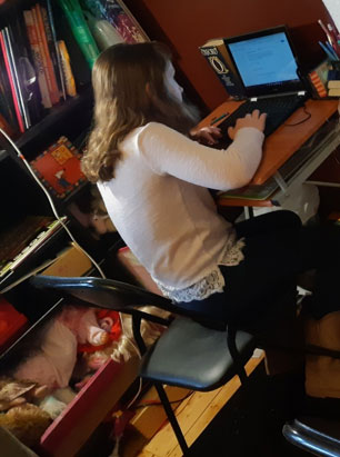 Figures 4 and 5 demonstrate before and after of our set up and effects on my daughter’s posture: Modifications included lifting the screen height, using a separate keyboard and mouse, and the posture corrected itself. Is it perfect, no it isn’t, however is it better than before? …. YES!! and the strain on the body is significantly less. Please excuse the disorganised bookshelf in the background!